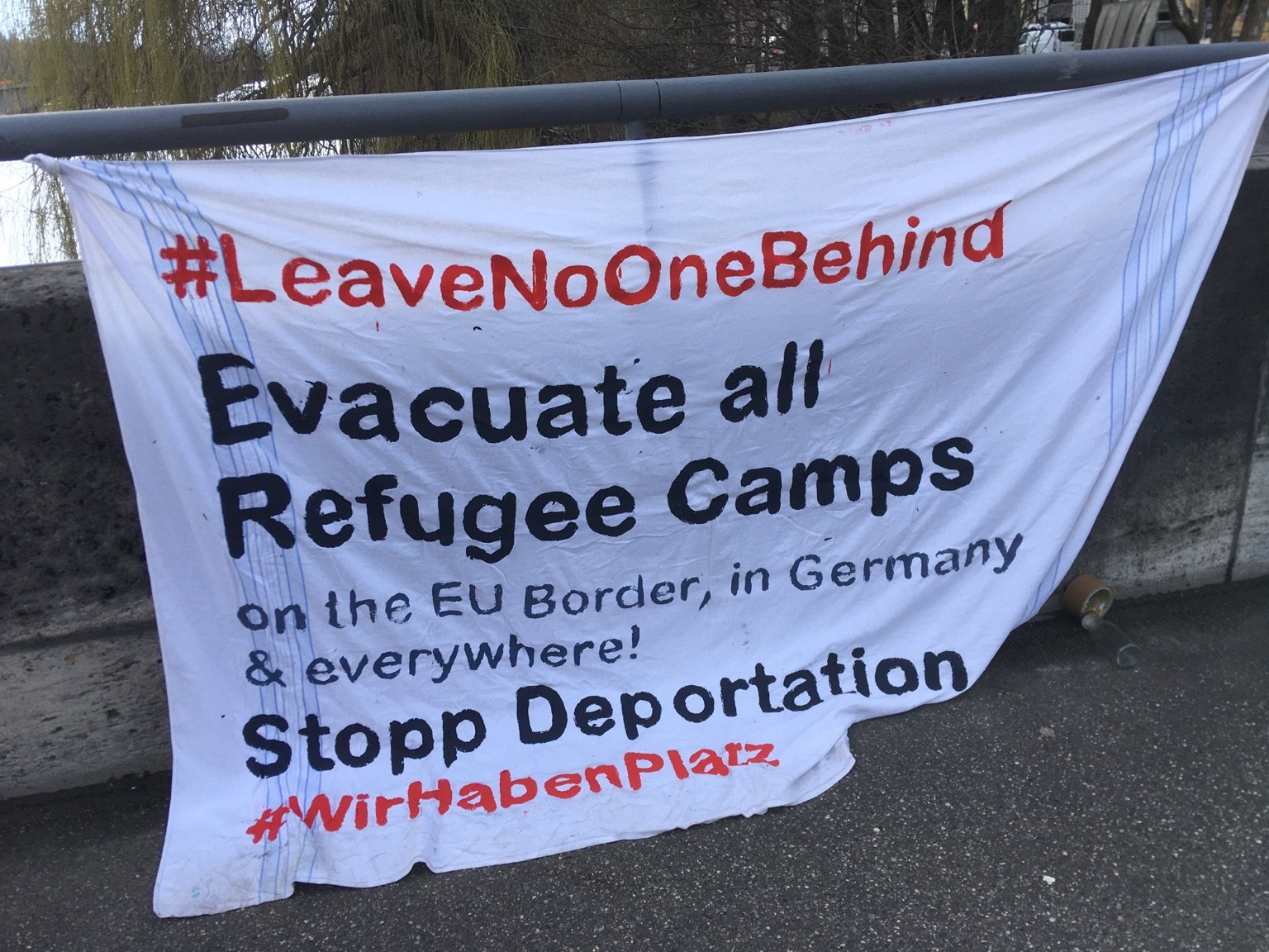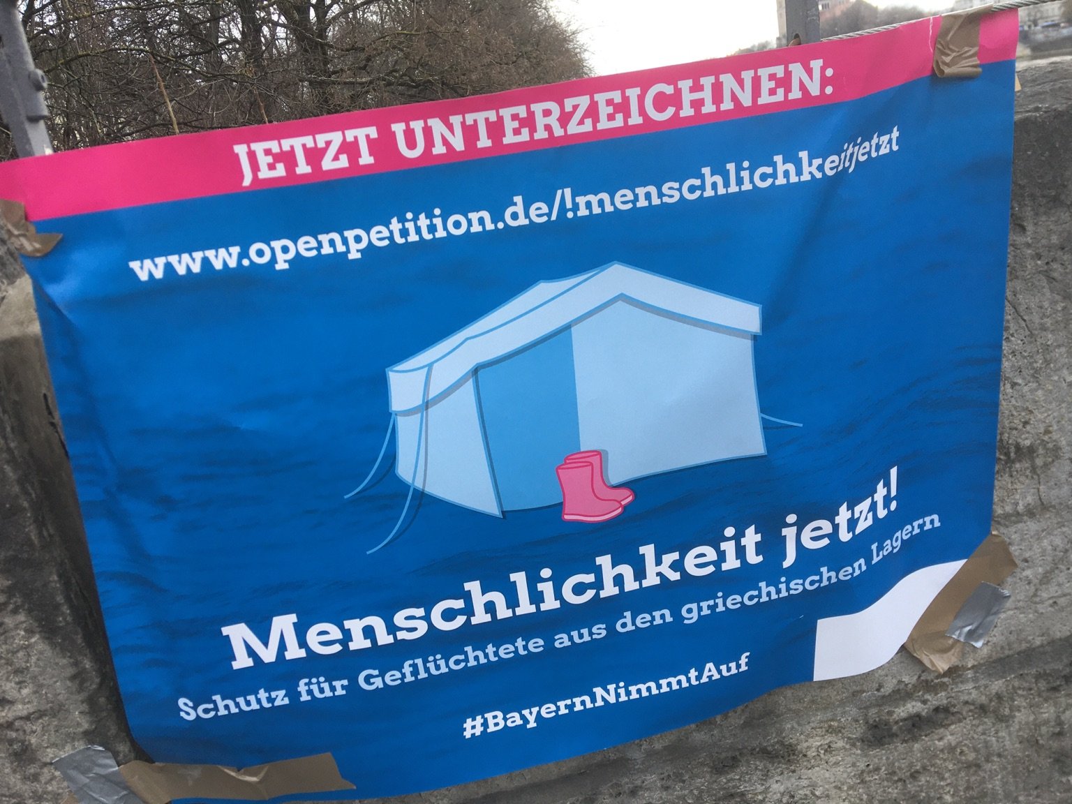 Unter dem Motto „Solidarität statt Grenzen – Aufnahme statt Abschottung“ gestalteten und bespielten bayerische Organisationen und Initiativen am 20. März 2021 die Reichenbachbrücke sowie die Corneliusbrücke in München. Von 14 bis 17 Uhr waren Audio- und Videobeiträge zu sehen und zu hören, die über die europäische Abschottungspolitik informierten und zu Solidarität mit Geflüchteten aufriefen. Um 17.30 Uhr gab es eine Abschlussaktion vor dem EU Büro am Bob – van – Benthem – Platz 1.